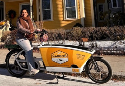 (Maha, above, taking a CargoB for a spin!) Founded by former LivableStreets Alliance Board Member Dorothy Fennell, CargoB is the country’s first cargo bike share. Available by the minute or by the day, CargoB makes it easy to move kids, groceries, and gear and now can also be found at a growing number MBTA stations. Download the app, scan, and ride!